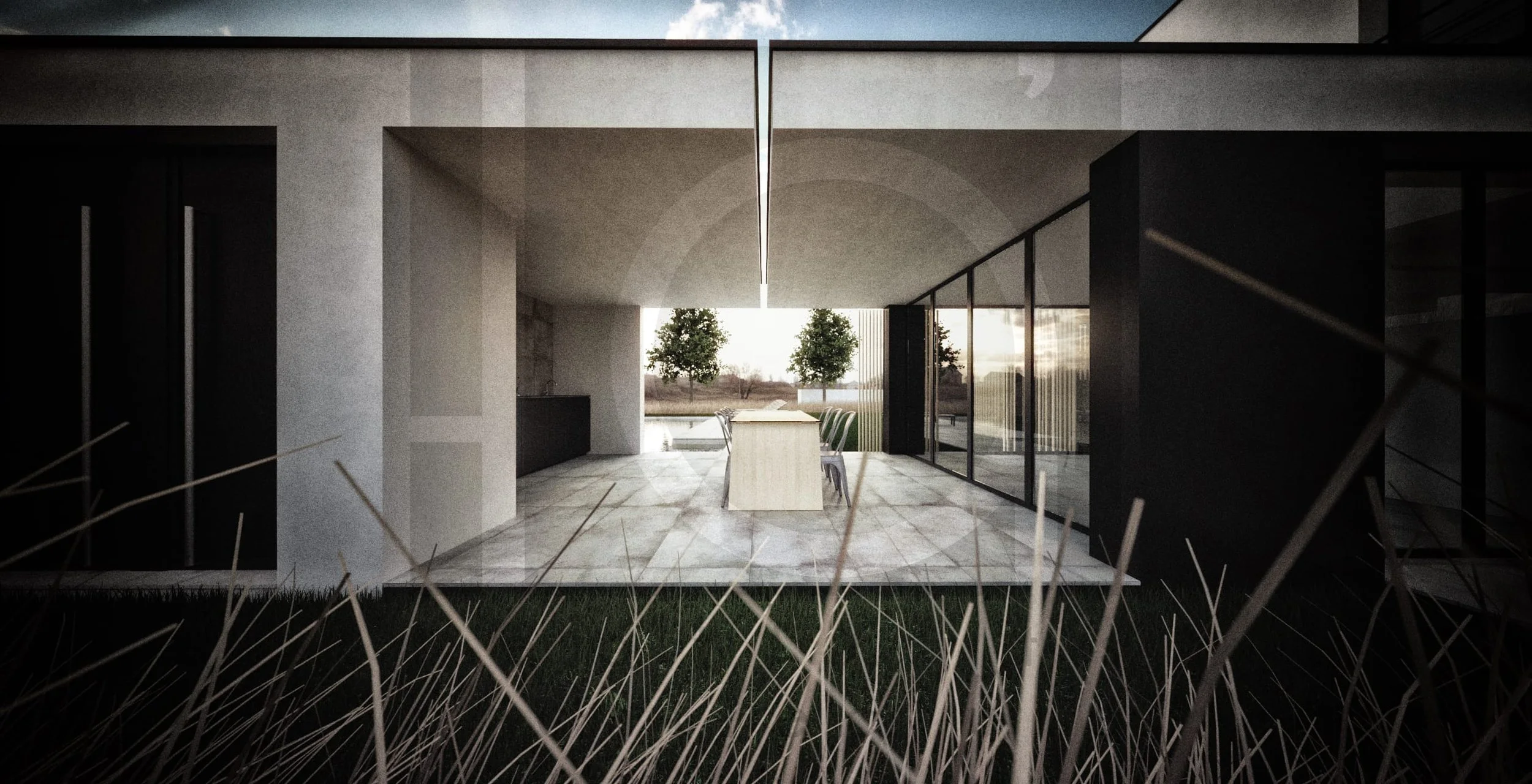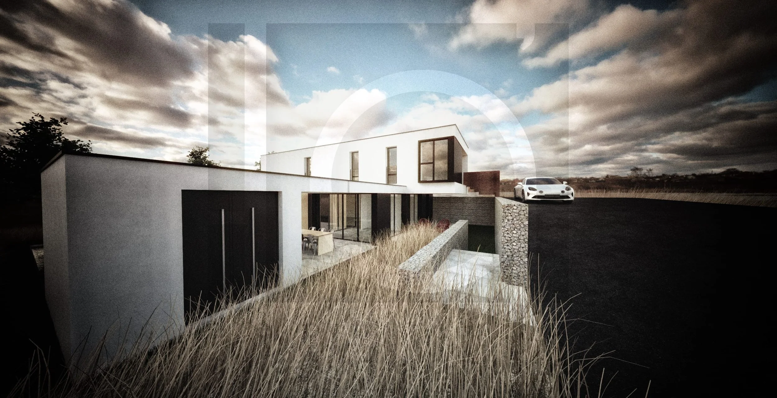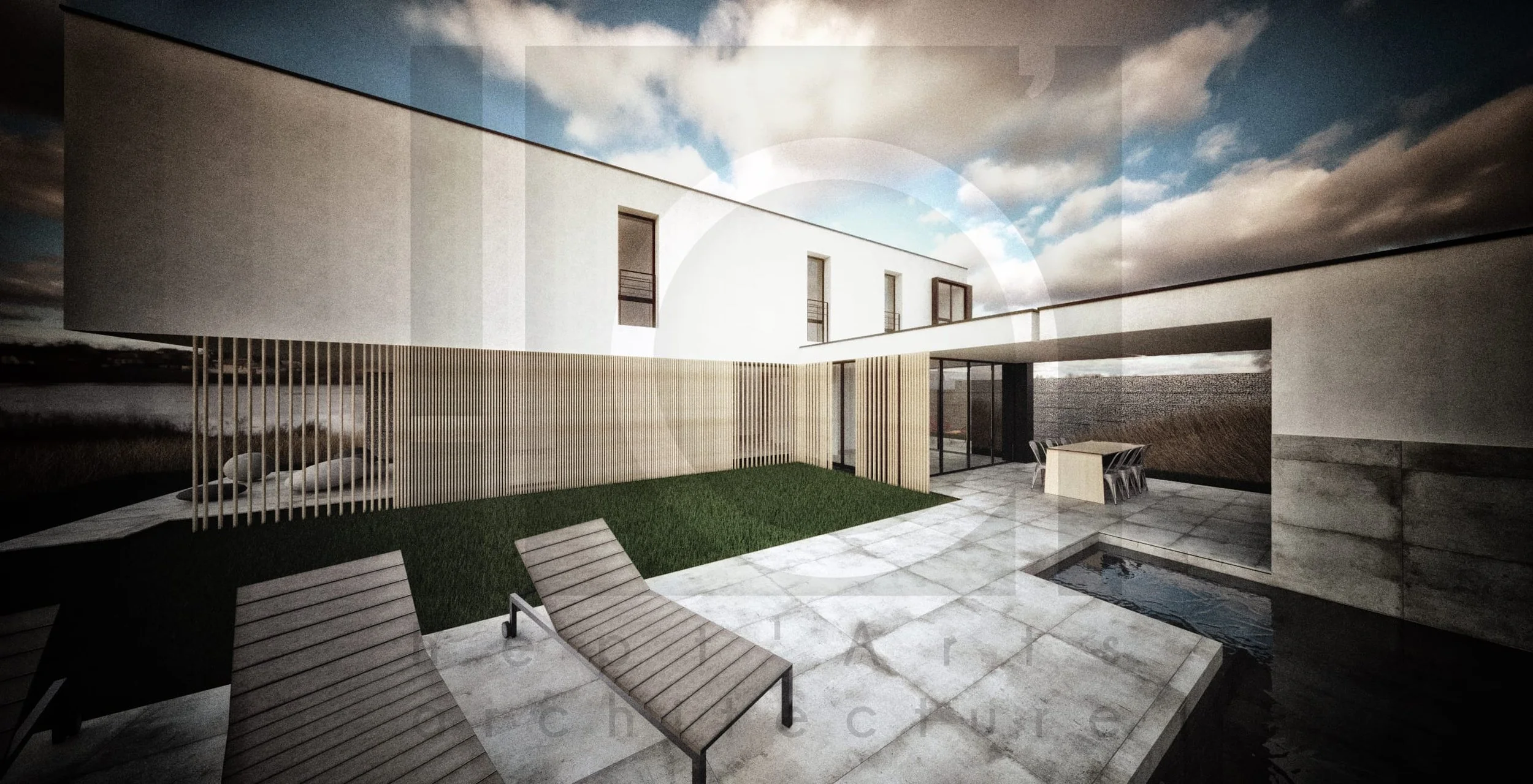 / La maison accueille des espaces de vie généreux sur le niveau bas, s’organisant autour d’une forme de patio central avec terrasses et piscine, 4 chambres dont 1 suite parentale à l’étage.